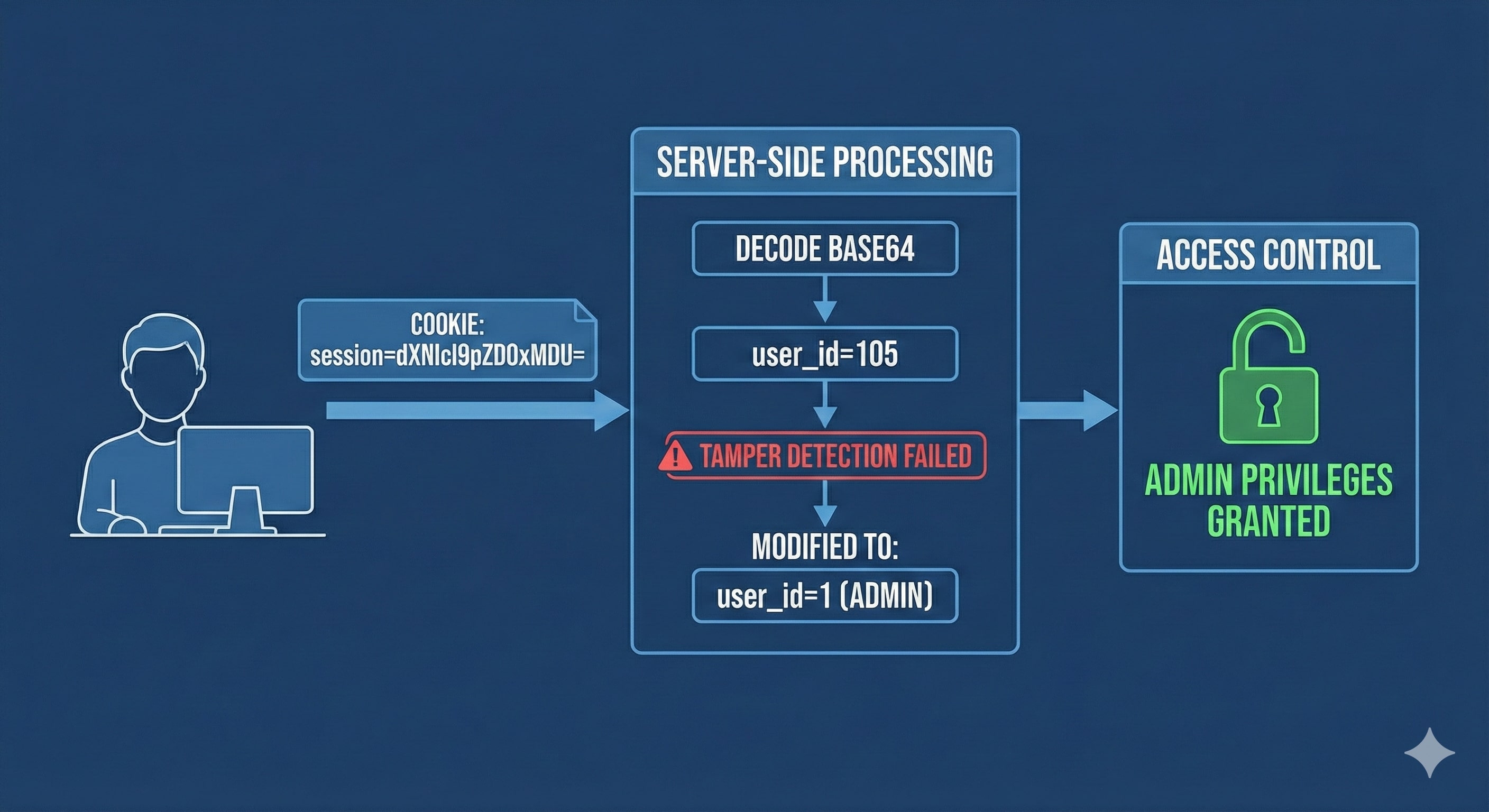 Bypass: The attacker replaces their cookie with the new string, refreshes the page, and instantly gains Administrative privileges.